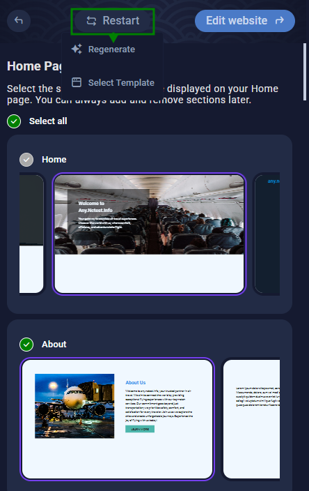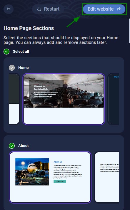 Once you have selected a template, the system will redirect you to the Sitejet Website Builder (CMS) website with the applied template. It will look like like this: