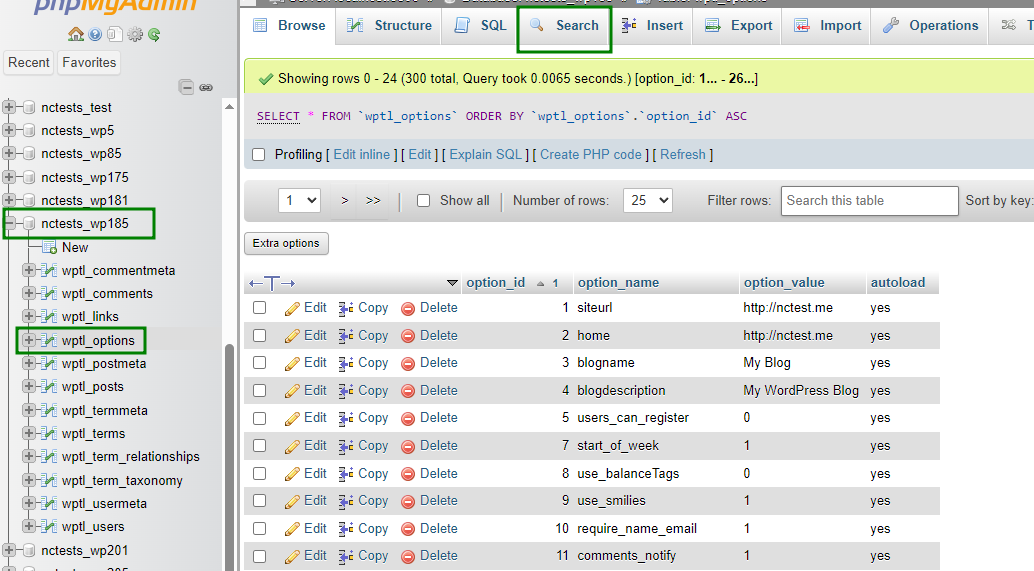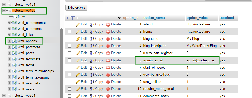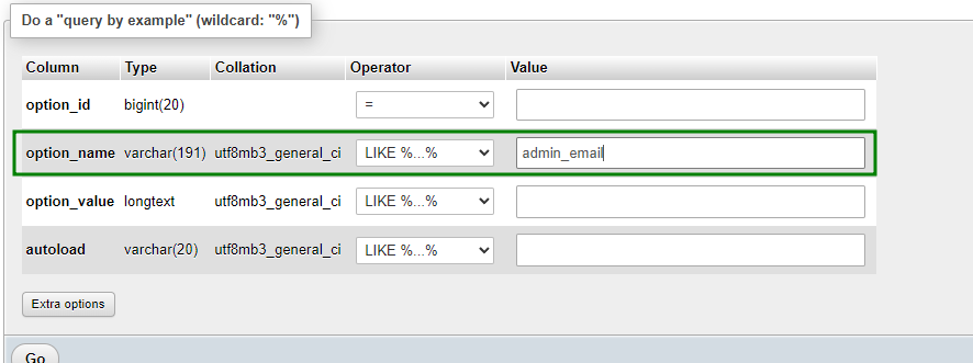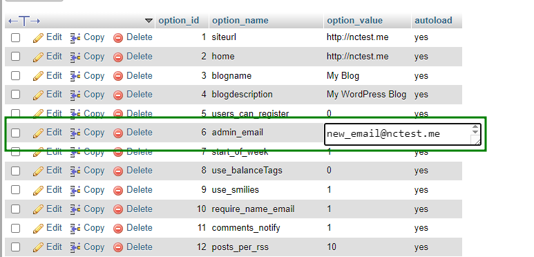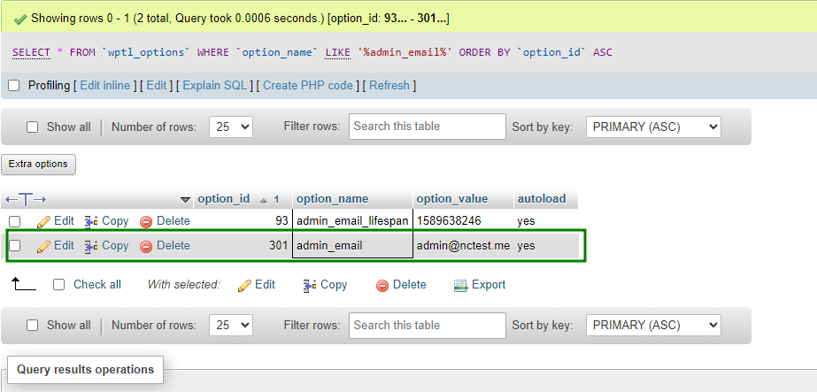 row may not always appear on the first page of the wp_options table. In that case, use the Search option to locate it:admin_email