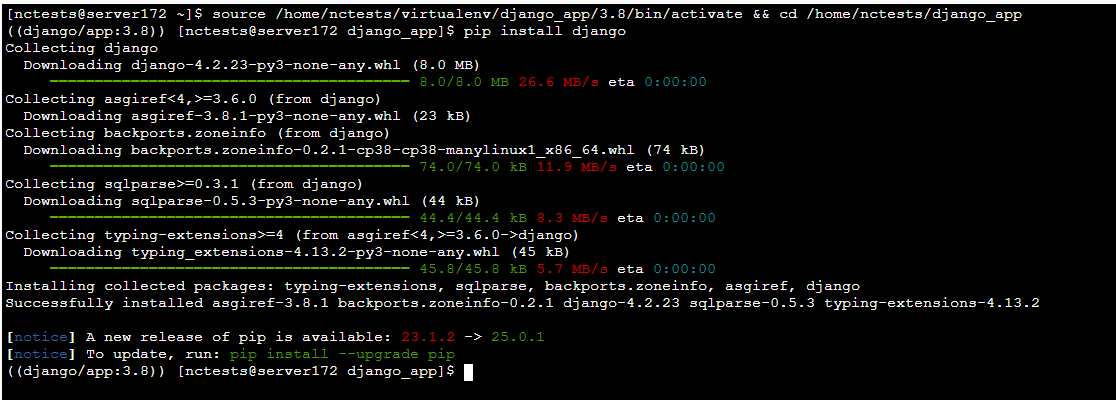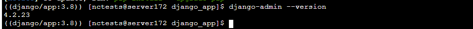 installs the latest available Django version. To install a specific version, use the following command (replace version with the desired version number):Module/Python version | 2.7.18 | 3.3.7 | 3.4.9 | 3.5.9 | 3.6.15/3.7.16 |