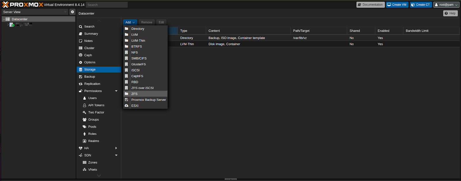 Before creating VMs or containers, you’ll need to configure storage for virtual disks and backups. Proxmox supports several storage backends, but the two most common are ZFS and LVM.
