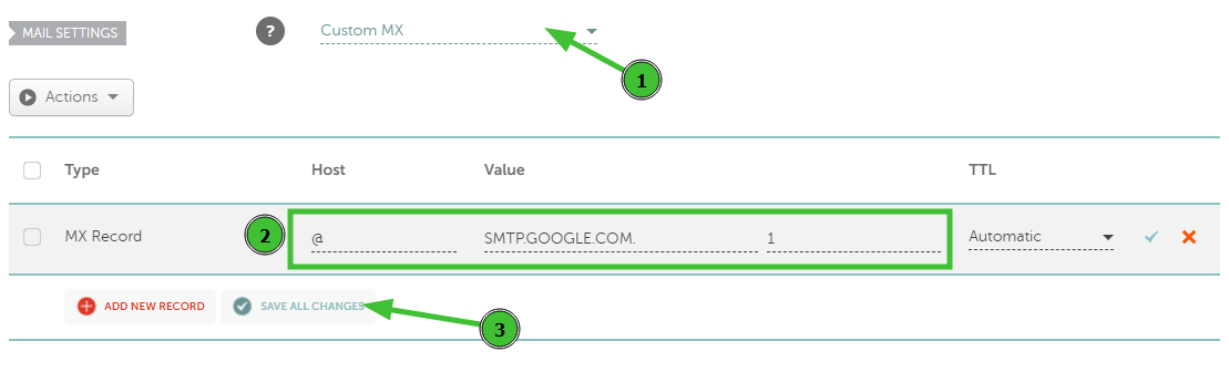 Type: MX Record | Host: @ | Value: SMTP.GOOGLE.COM | Priority: 1 | TTL: Automatic